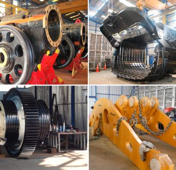 2000 m2 destinados a la fabricación de componentes para equipos de alto tonelaje usados en minería, con puesta gura de 80 toneladas, un horno modular para tratamiento térmico de alivio de tensiones, mesa de corte, sala de granallado, control de calidad, mandrinadora a piso, con la capacidad para fabircar, Baldes de Pala, Bastidores, Poleas Punta Pluma, Mangos, etc.